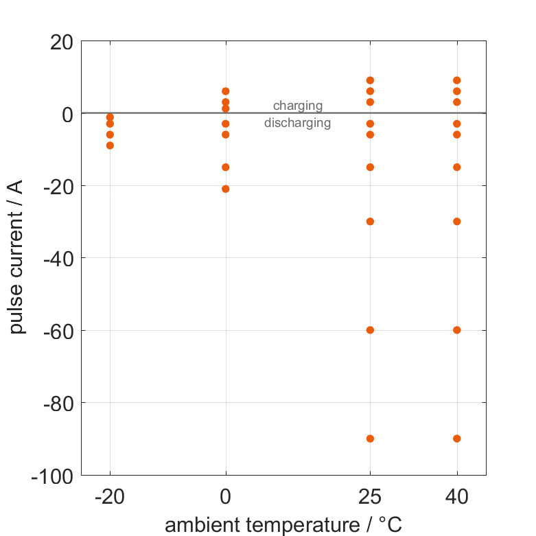 The cell is discharged from 100% SOC or charged from 0% SOC with current pulses followed by no-load phases at different ambient temperatures. The thermal boundary condition is free convection. The measurement stops when reaching either the voltage of 2V or 4.2V or the surface temperature of 80°C. The graph shows for which ambient temperatures and pulse currents measurements are available.