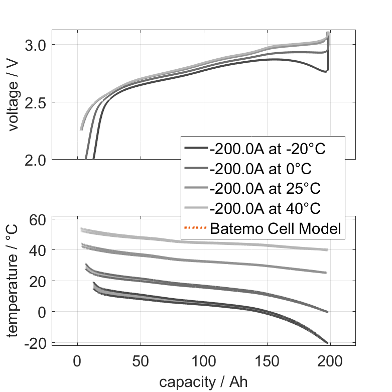 The nominal capacity originates from the manufacturer’s data sheet, if available. When the data sheet is unavailable, the nominal capacity is estimated. Batemo measured the C/10 capacity by discharging the cell at an ambient temperature of 25°C from 100% with a constant current of 20A (0.1C) until reaching the voltage of 2V. The thermal boundary condition is free convection. |