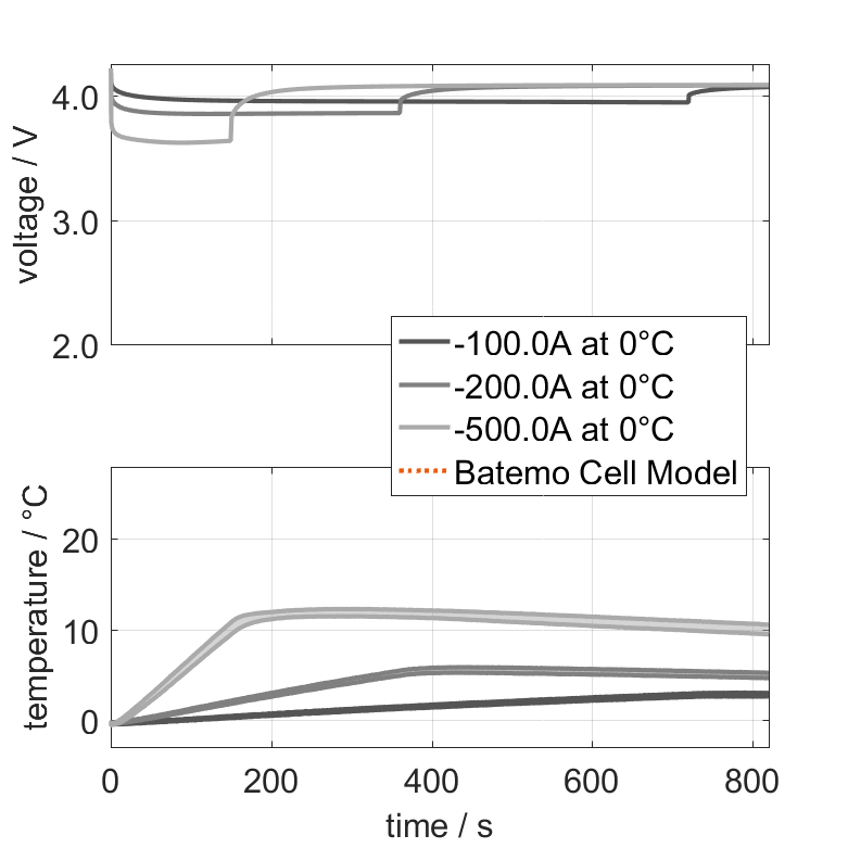 The Batemo Cell Model of the lithium-ion battery cell Sunwoda SFP-01-2070 is a high-precision, physical cell model with global validity. As a digital twin it seamlessly integrates into your research, development and battery analytics by basing your decisions on simulations. See the details to learn more about the features and capabilities of the Batemo Cell Model. Batemo demonstrates the accuracy and validity of the Batemo Cell Model by comparing battery simulation and measurement data in the range given below. Validation is extensive, experimental characterization covers the total operational area of the cell: At low and high temperatures, up to the maximal current and in the whole state of charge range.