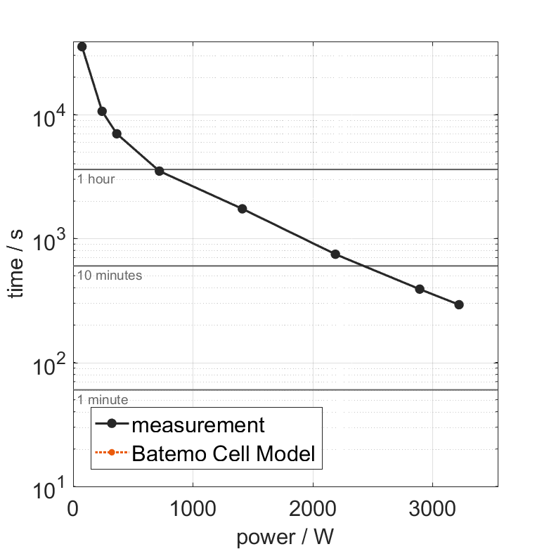 The cell is discharged from 100% SOC with different constant currents at 25°C. The thermal boundary condition is free convection. The measurement stops when reaching either the voltage of 2V or the surface temperature of 60°C. The graph shows the derived experiment duration and average power of the experiment.