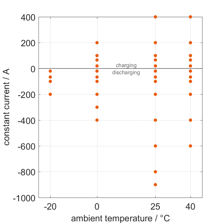 The cell is discharged from 100% SOC or charged from 0% SOC with different constant currents at different ambient temperatures. The thermal boundary condition is free convection. The measurement stops when reaching either the voltage of 2V or 4.25V or the surface temperature of 60°C. The graph shows for which ambient temperatures and charging and discharging constant currents measurements are available.