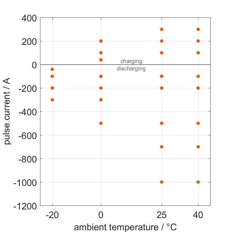 The cell is discharged from 100% SOC or charged from 0% SOC with current pulses followed by no-load phases at different ambient temperatures. The thermal boundary condition is free convection. The measurement stops when reaching either the voltage of 2V or 4.25V or the surface temperature of 60°C. The graph shows for which ambient temperatures and pulse currents measurements are available.