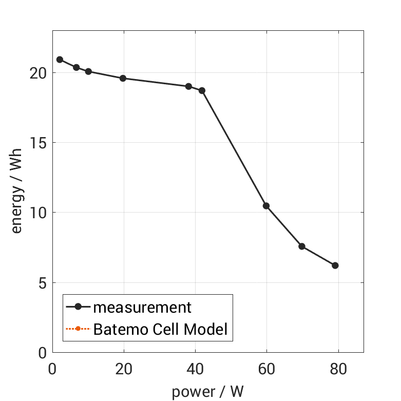 All quantities are measurement results from the Batemo battery laboratory. The continuous power is the highest power that completely discharges the cell without overheating it. Therefore, the cell is discharged from 100% state of charge (SOC) at an ambient temperature of 25°C with a constant current until a residual state of charge of 10% and either the lower voltage limit of 2.5V or 90% of the maximum surface temperature ( 54°C) is reached. The peak power is the power the cell can supply for 5 minutes. The cell is therefore discharged from 100% SOC at an ambient temperature of 25°C with a constant current until it reaches either the lower voltage limit of 2.5V or the maximum surface temperature of 60°C after 5 minutes. For cells that reach the maximum temperature limit, the measured power is directly taken as peak power. For cells that do not reach the maximum surface temperature after 5 minutes because they reach the lower voltage limit first, the measured power is multiplied by a correction factor that estimates the power that would have heated the cell to the maximum surface temperature within 5 minutes. The thermal boundary condition is free convection. These operating conditions may be outside the cell manufacturer’s specification. |
