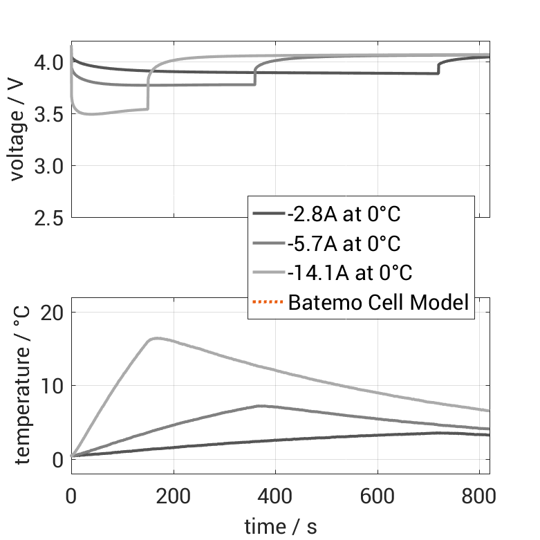 The Batemo Cell Model of the lithium-ion battery cell Tenpower INR21700-58HE(C) is a high-precision, physical cell model with global validity. As a digital twin it seamlessly integrates into your research, development and battery analytics by basing your decisions on simulations. See the details to learn more about the features and capabilities of the Batemo Cell Model. Batemo demonstrates the accuracy and validity of the Batemo Cell Model by comparing battery simulation and measurement data in the range given below. Validation is extensive, experimental characterization covers the total operational area of the cell: At low and high temperatures, up to the maximal current and in the whole state of charge range.