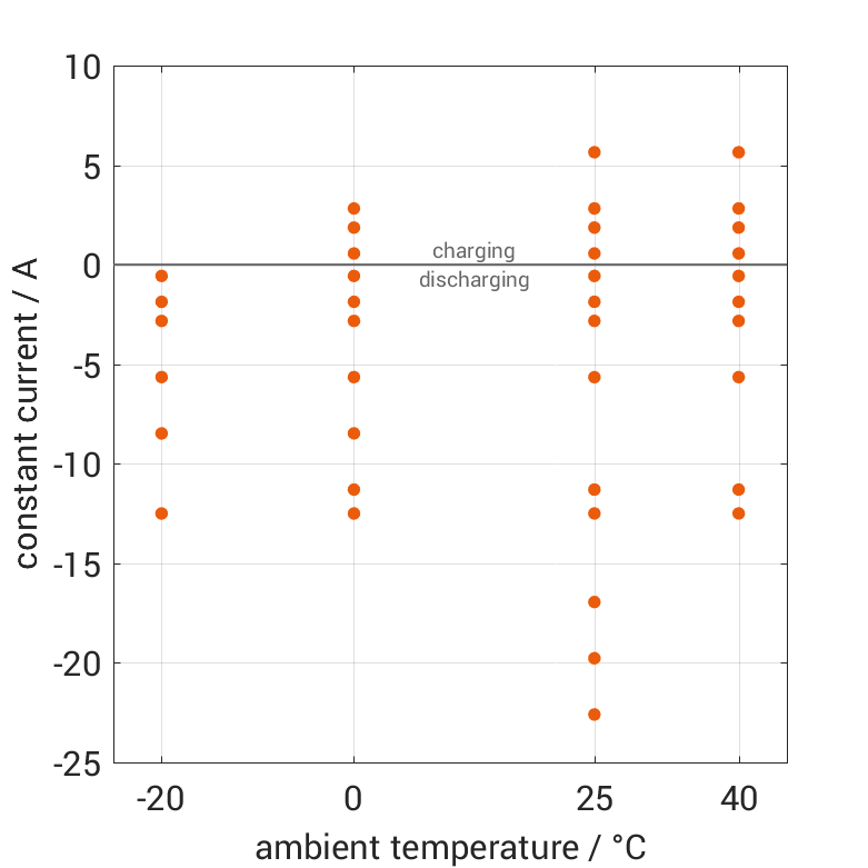 The cell is discharged from 100% SOC or charged from 0% SOC with different constant currents at different ambient temperatures. The thermal boundary condition is free convection. The measurement stops when reaching either the voltage of 2.5V or 4.2V or the surface temperature of 60°C. The graph shows for which ambient temperatures and charging and discharging constant currents measurements are available.