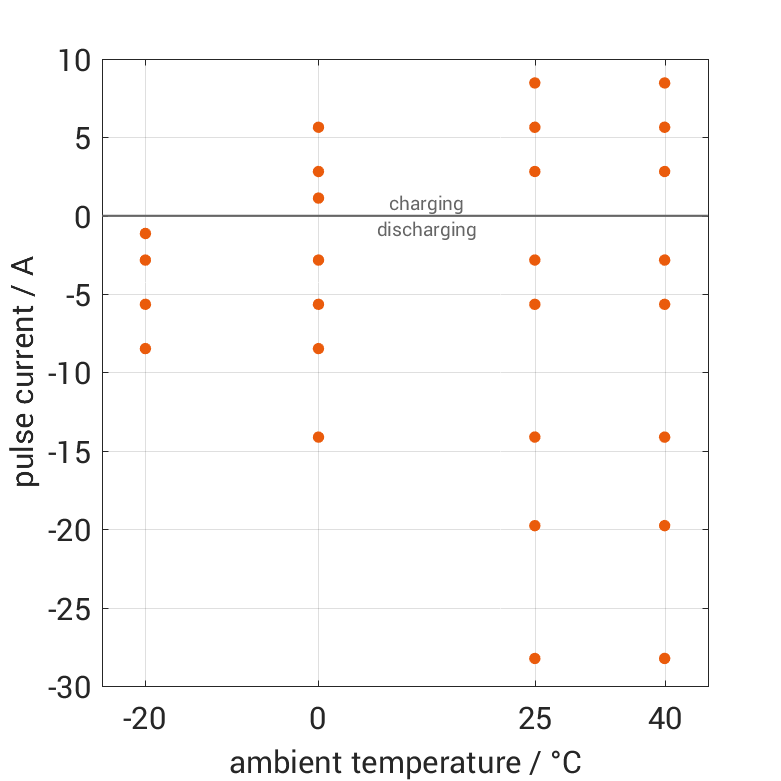 The cell is discharged from 100% SOC or charged from 0% SOC with current pulses followed by no-load phases at different ambient temperatures. The thermal boundary condition is free convection. The measurement stops when reaching either the voltage of 2.5V or 4.2V or the surface temperature of 60°C. The graph shows for which ambient temperatures and pulse currents measurements are available.
