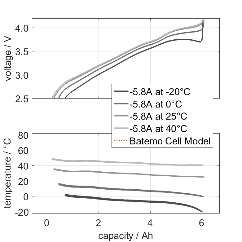 The nominal capacity originates from the manufacturer’s data sheet, if available. When the data sheet is unavailable, the nominal capacity is estimated. Batemo measured the C/10 capacity by discharging the cell at an ambient temperature of 25°C from 100% with a constant current of 0.58A (0.1C) until reaching the voltage of 2.5V. The thermal boundary condition is free convection. |