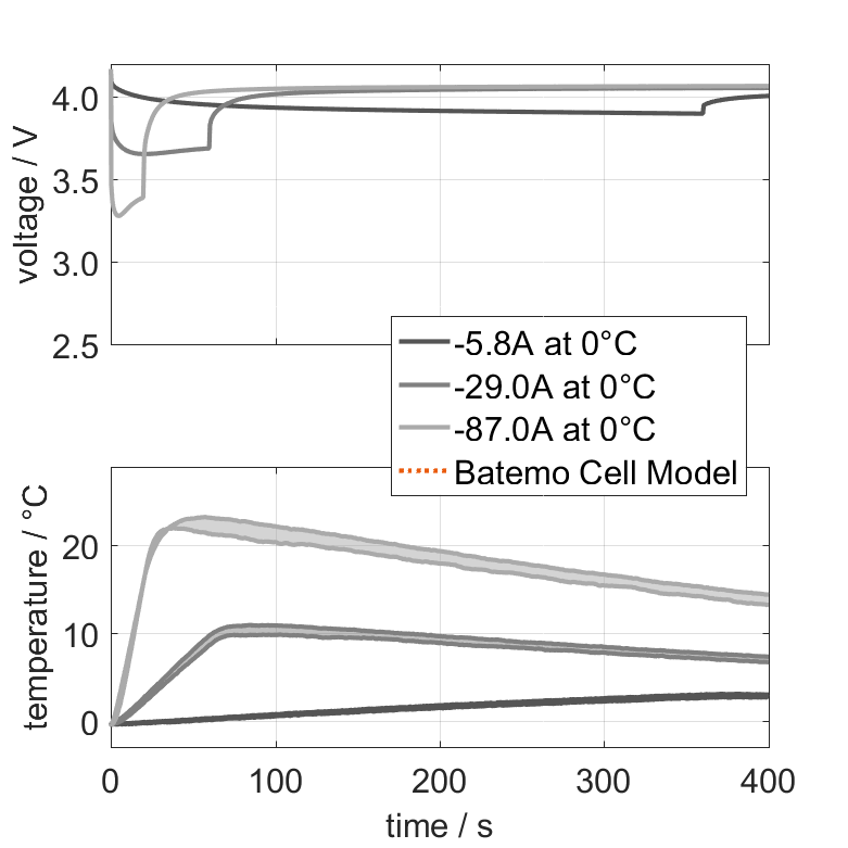 The Batemo Cell Model of the lithium-ion battery cell V4Smart V21700HP-5X(A1) is a high-precision, physical cell model with global validity. As a digital twin it seamlessly integrates into your research, development and battery analytics by basing your decisions on simulations. See the details to learn more about the features and capabilities of the Batemo Cell Model. Batemo demonstrates the accuracy and validity of the Batemo Cell Model by comparing battery simulation and measurement data in the range given below. Validation is extensive, experimental characterization covers the total operational area of the cell: At low and high temperatures, up to the maximal current and in the whole state of charge range.