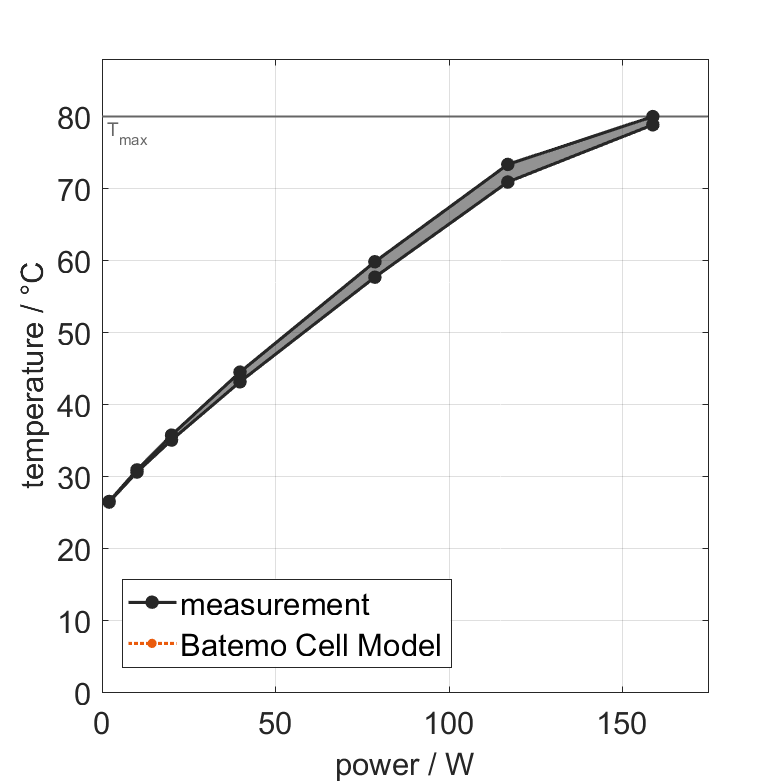 All quantities are measurement results from the Batemo battery laboratory. The continuous current is the highest current that completely discharges the cell without overheating it. Therefore, the cell is discharged from 100% state of charge (SOC) at an ambient temperature of 25°C with a constant current until a residual state of charge of 10% and either the lower voltage limit of 2.5V or 90% of the maximum surface temperature (72°C) is reached. The peak current is the current that the cell can supply for 5 minutes. The cell is therefore discharged from 100% SOC at an ambient temperature of 25°C with a constant current until it reaches either the lower voltage limit of 2.5V or the maximum surface temperature of 80°C after 5 minutes. For cells that reach the maximum surface temperature, the measured current is taken directly as the peak current. For cells that do not reach the maximum surface temperature after 5 minutes because they reach the lower voltage limit first, the measured current is multiplied by a correction factor that estimates the current that would have heated the cell to the maximum surface temperature within 5 minutes. The thermal boundary condition is free convection. These operating conditions may be outside the cell manufacturer’s specification. |