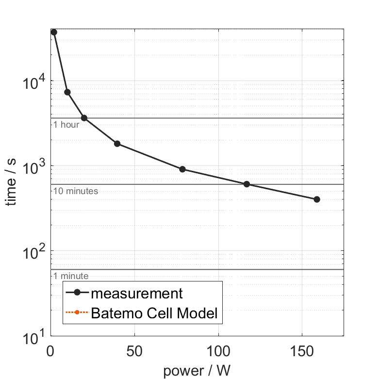 All quantities are measurement results from the Batemo battery laboratory. The continuous power is the highest power that completely discharges the cell without overheating it. Therefore, the cell is discharged from 100% state of charge (SOC) at an ambient temperature of 25°C with a constant current until a residual state of charge of 10% and either the lower voltage limit of 2.5V or 90% of the maximum surface temperature ( 72°C) is reached. The peak power is the power the cell can supply for 5 minutes. The cell is therefore discharged from 100% SOC at an ambient temperature of 25°C with a constant current until it reaches either the lower voltage limit of 2.5V or the maximum surface temperature of 80°C after 5 minutes. For cells that reach the maximum temperature limit, the measured power is directly taken as peak power. For cells that do not reach the maximum surface temperature after 5 minutes because they reach the lower voltage limit first, the measured power is multiplied by a correction factor that estimates the power that would have heated the cell to the maximum surface temperature within 5 minutes. The thermal boundary condition is free convection. These operating conditions may be outside the cell manufacturer’s specification. |