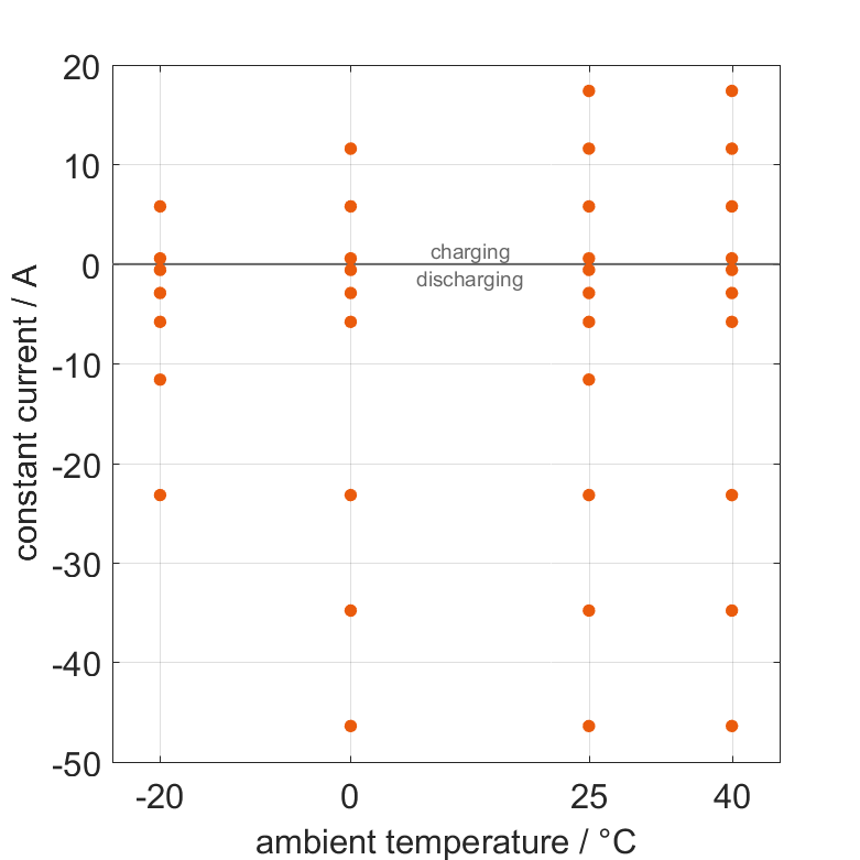 The cell is discharged from 100% SOC or charged from 0% SOC with different constant currents at different ambient temperatures. The thermal boundary condition is free convection. The measurement stops when reaching either the voltage of 2.5V or 4.2V or the surface temperature of 80°C. The graph shows for which ambient temperatures and charging and discharging constant currents measurements are available.