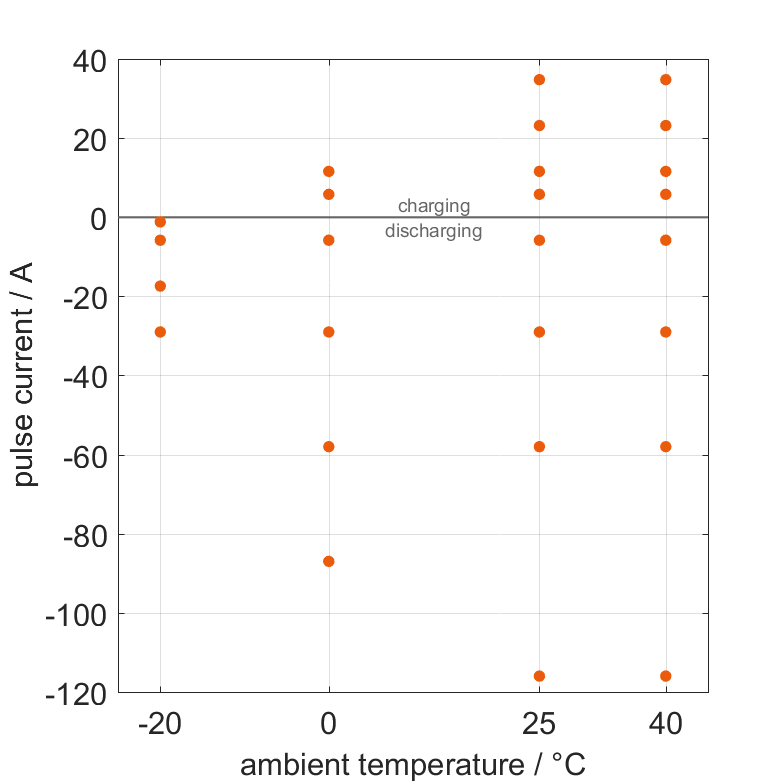 The cell is discharged from 100% SOC or charged from 0% SOC with current pulses followed by no-load phases at different ambient temperatures. The thermal boundary condition is free convection. The measurement stops when reaching either the voltage of 2.5V or 4.2V or the surface temperature of 80°C. The graph shows for which ambient temperatures and pulse currents measurements are available.